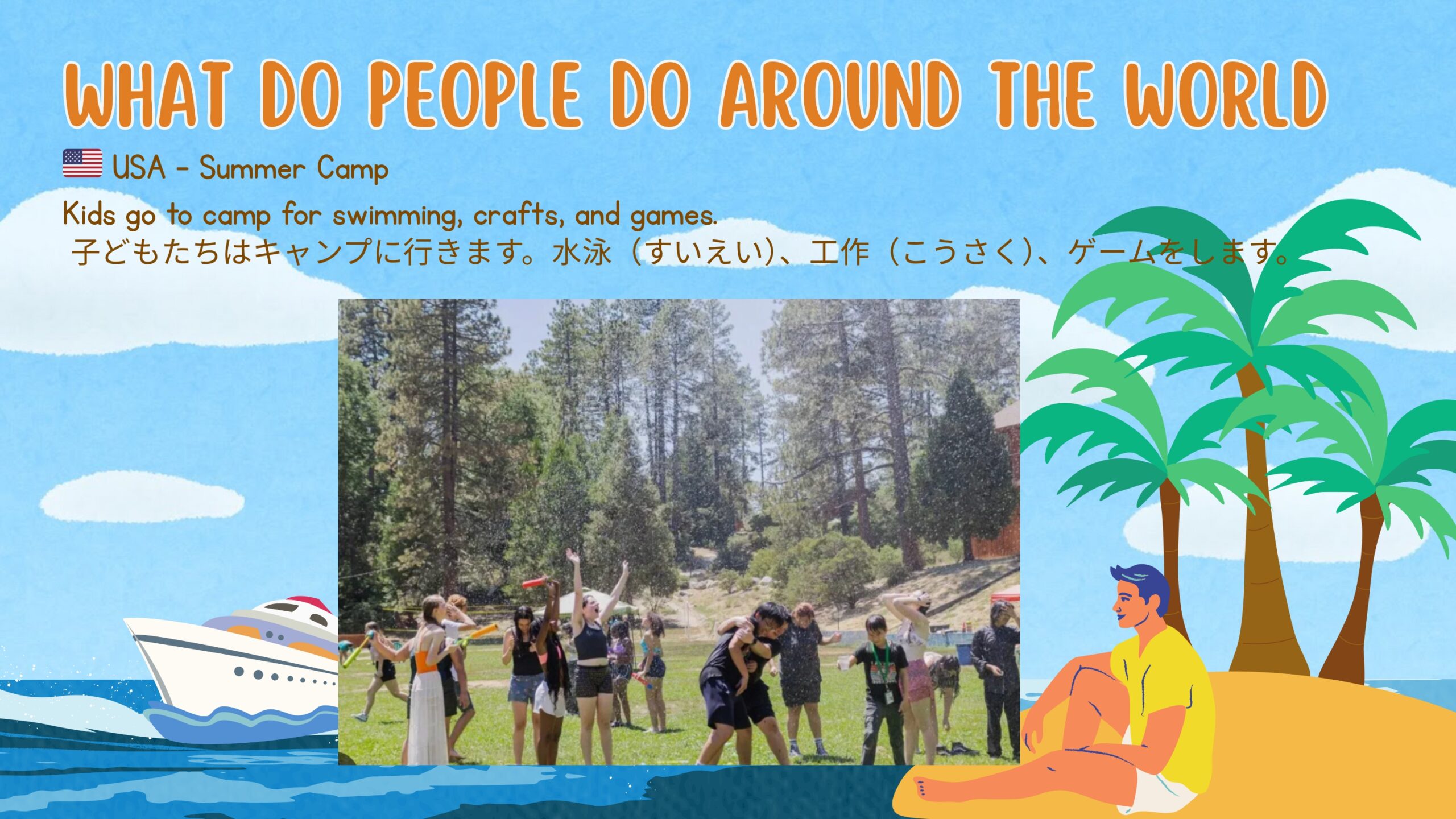 高校生のお兄さんたちのアメリカで過ごした夏休みの話を写真つきで教えてくれたよ。キャンプに行ってバーベキューやったり楽しそうだったよ!
